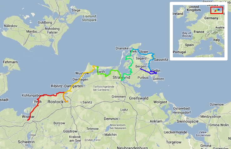 Son 410 km siguiendo la costa y alrededor de la isla de Rügen (de momento, y mientras no compren Mallorca, la mayor isla de Alemania).